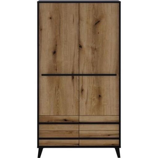 En savoir +Armoire de chambre HEKA 180cm hauteur. Fabriqué en mélamine noire pour le contour du meuble et en mélamine chene rustique pour les portes et façades tiroirs. 2 Portes + 4 tiroirs. Poignées et pieds en noir.
