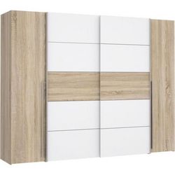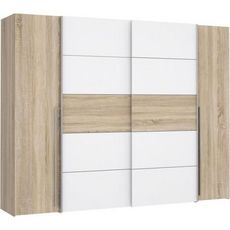 Cette armoire NARAGO de 270 cm de longueur est équipée de 2 portes coulissantes et de 2 portes battantes. Elle est aménagée avec 2 tringles a habits et 2 tablettes derriere les portes coulissantes, et 2x4 tablettes derriere les portes battantes. Sa couleur chene Sonoma et blanc mat ainsi que son aspect bois lui conferent un style altique et intemporel.