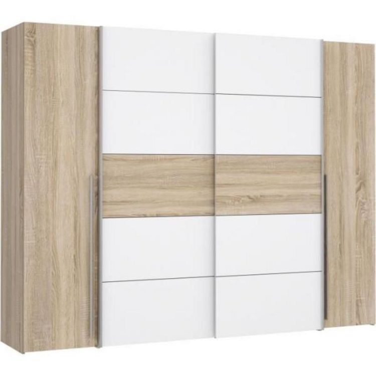 Cette armoire NARAGO de 270 cm de longueur est équipée de 2 portes coulissantes et de 2 portes battantes. Elle est aménagée avec 2 tringles a habits et 2 tablettes derriere les portes coulissantes, et 2x4 tablettes derriere les portes battantes. Sa couleur chene Sonoma et blanc mat ainsi que son asp