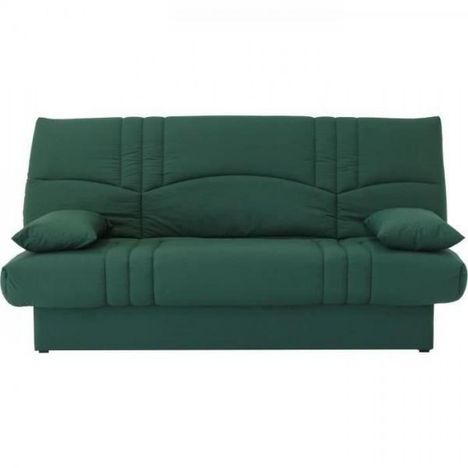 Banquette clic clac 3 places Vert foret - Style contemporain - Canapé 3 places en tissu vert foret avec dimensions de couchage de 130 x 190 cm. Livré avec deux coussins assortis. Pratique et gain de place, idéal pour les petits intérieurs ou pour accueillir des invités. Fabriqué au Portugal avec des