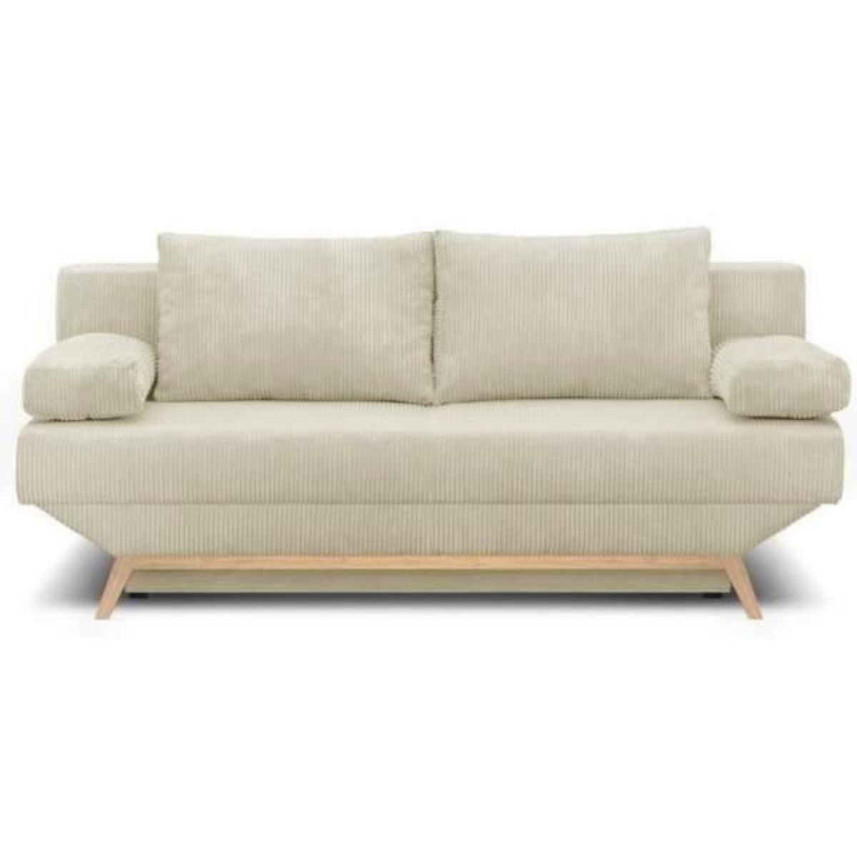 Banquette convertible 3 places TEIJO en velours côtelé beige avec coffre de rangement. Style et design contemporain. Dimensions : L 190 x H 92 x P 84 cm. Couchage : 140 x 190 cm. Epaisseur du matelas : 16 cm. Structure en bois et panneaux de particules. Pieds en bois. Confort ferme. Poids net : 60 k