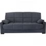 Canapé convertible fonction clic-clac 3 places en tissu gris anthracite de style contemporain. Dimensions L223 x P96 x 103 cm. Matelas de 14 cm d'épaisseur. Coffre de rangement et déhoussable. Confort ferme pour un couchage quotidien. Marque MEGAN.