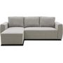 Canapé d'angle convertible 3 a 4 places, réversible, avec coffre de rangement en tissu beige. Dimensions : L224 x P155 x H71/85 cm. Couchage : 122x191x7cm. Densité de la mousse : 25kg/m3. Matériaux : panneau de particules, bois dur, Isorel, panneau de copeaux.