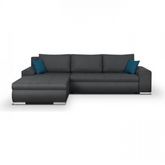INDIAN canapé d'angle 5 places convertible et réversible avec coffre de rangement - structure en pin massif FSC et panneaux de particules - suspension d'assise en ressorts métalliques plats - mousse de polyuréthane 30kg/m3 - garnissage des coussins en flocons de mousse et fibres de polyester - revetement tissu 100% polyester - pieds avant en métal chromé et pieds arriere en plastique noir.