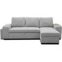 Canapé d'angle convertible 3 places, réversible, avec coffre de rangement et grand pouf. Tablette sur l'accoudoir avec port USB. Revetu de tissu Souris 100% Polyester. Dimensions : L247xP143xH86 cm. Couchage : 132x190x8cm. Densité de la mousse : 25kg/m3 28kg/m3. Matériaux : panneau de particules 10