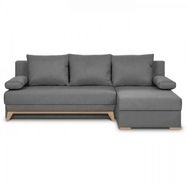 Canapé d'angle réversible et convertible TEIJO en tissu gris avec coffre de rangement. Structure en pin massif certifié FSC et panneaux de particules, suspension d'assise en ressorts biconiques, garnissage du coussin d'assise en mousse de polyuréthane 30kg/m3 et des coussins de dossier en flocons de