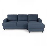 PAUL Canapé d'angle droit 4 places bleu - Style et design contemporain - Structure en pin massif contreplaqué et panneaux de particules - Tissu 100% polyester - Assise en mousse polyuréthane 25kg/m3 - Dos mousse polyuréthane 21kg/m3 - Coussins garnis de ouate et fibre 150gr/m2 - Pieds en plastique noir - Canapé L 215 x P 140 x H 86 cm - Faible encombrement - Confort assise mi-ferme - Coussins de dos moelleux