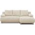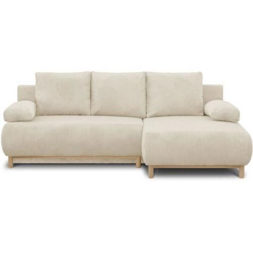 MIKA canapé d'angle droit convertible 3 places beige avec son coffre de rangement. Style et design Japandi - Pin massif, panneau de particules et panneau MDF - Revetement en velours côtelés 100% polyester - pieds bois massif vernis couleur naturelle - Couchage : 130 cm x 210 cm - Coffre de rangemen