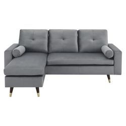 Nous vous présentons ici un canapé d'angle fixe et réversible New York, en tissu gris. C'est une structure en bois massif et des pieds bois et doré. Les dimensions de ce canapé sont : Long 194cm x Larg 139cm x Haut 83 cm. C'est un canapé fonctionnel et confortable, qui saura habiller votre intérieur
