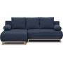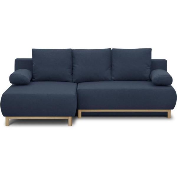 MIKA canapé d'angle gauche convertible 3 places bleu foncé avec son coffre de rangement - Style et design Japandi - Pin massif, panneau de particules et panneau MDF - Revetement en tissu 100% polyester - pieds en bois massif vernis couleur naturelle - Couchage : 130 cm x 210 cm - Coffre de rangemen
