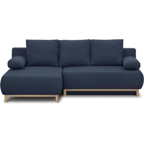 En savoir +MIKA canapé d'angle gauche convertible 3 places bleu foncé avec son coffre de rangement - Style et design Japandi - Pin massif, panneau de particules et panneau MDF - Revetement en tissu 100% polyester - pieds en bois massif vernis couleur naturelle - Couchage : 130 cm x 210 cm - Coffre de rangement : L 117 cm x P 56 cm x H 19 cm