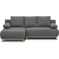 MIKA canapé d'angle gauche convertible 3 places gris clair avec son coffre de rangement - Style et design Japandi - Pin massif, panneau de particules et panneau MDF - Revetement en tissu 100% polyester - pieds en bois massif vernis couleur naturelle - Couchage : 130 cm x 210 cm - Coffre de rangemen