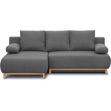 En savoir +MIKA canapé d'angle gauche convertible 3 places gris clair avec son coffre de rangement - Style et design Japandi - Pin massif, panneau de particules et panneau MDF - Revetement en tissu 100% polyester - pieds en bois massif vernis couleur naturelle - Couchage : 130 cm x 210 cm - Coffre de rangement : L 117 cm x P 56 cm x H 19 cm