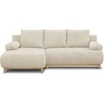 MIKA canapé d'angle gauche convertible 3 places beige avec son coffre de rangement. Style et design Japandi - Pin massif, panneau de particules et panneau MDF - Revetement en velours côtelés 100% polyester - pieds bois massif vernis couleur naturelle - Couchage : 130 cm x 210 cm - Coffre de rangeme