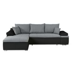 CELINA Canapé d'angle réversible convertible 3 places noir et gris - Structure en panneaux de particules - Revetement tissu 100% polyester - Assise garnie de mousse, densité 30 kg/m3 - Doté d'un coffre sous l'assise de la méridienne - Livré avec 2 coussins - Couchage d'appoint 150 x 190 cm - Assise L 204 x P 56 x H 45 cm - Canapé L 274 x P 184 x H 93 cm.