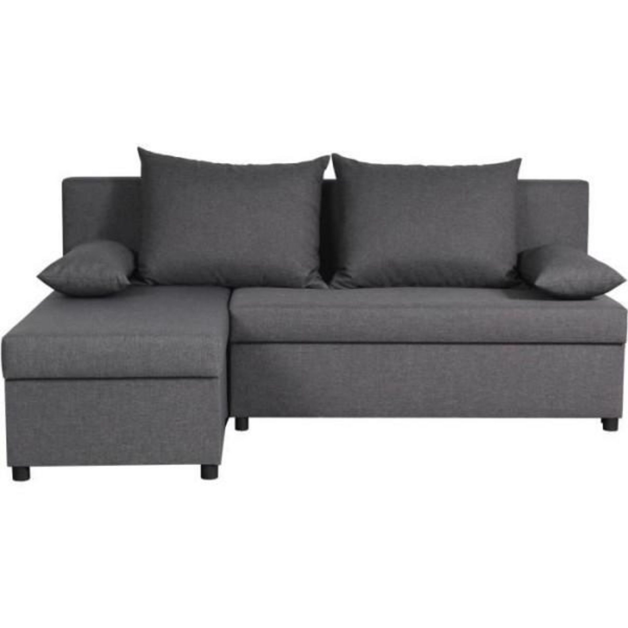 Canapé d'angle réversible JOSS en tissu gris 100% polyester. Structure en bois massif pins et hetre, panneaux de particules et contreplaqué. Pieds en plastique noir. Suspension ressort en métal type no-sag. Assise en mousse polyuréthane 25kg/m3. Coussins de dos en mousse polyuréthane 21kg/m3 et floc