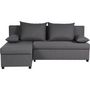 Canapé d'angle réversible JOSS en tissu gris 100% polyester. Structure en bois massif pins et hetre, panneaux de particules et contreplaqué. Pieds en plastique noir. Suspension ressort en métal type no-sag. Assise en mousse polyuréthane 25kg/m3. Coussins de dos en mousse polyuréthane 21kg/m3 et flocons de mousse. Dimensions : Longueur 192 cm x Hauteur 79 cm x Largeur 143 cm.