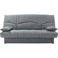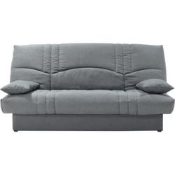 Le clic clac THELMA est un canapé convertible de couleur gris moyen en tissu Soro. Il offre un couchage de 125x190 cm avec un matelas d'épaisseur 13 cm. Ses dimensions sont L190 x P92 x H96 cm. Ce canapé 3 places de style altique - intemporel est déhoussable et dispose d'un coffre de rangement. Son confort d'assise est moelleux et il convient pour un couchage occasionnel.