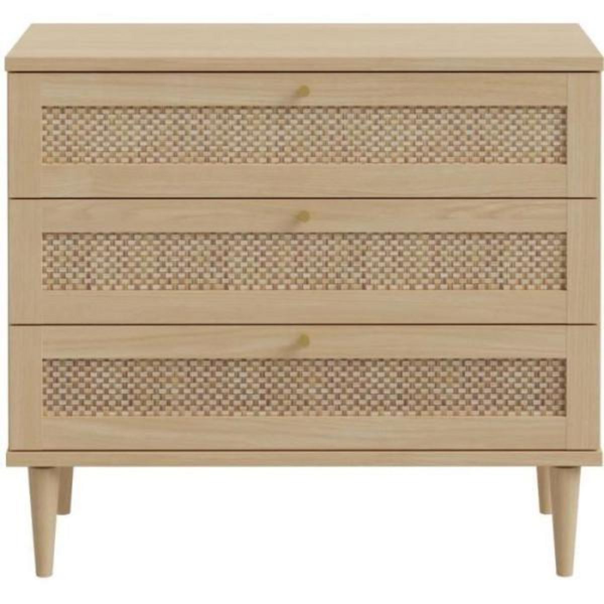 Commode CALASETTA 3 tiroirs : Ajoutez du style et de la fonctionnalité a votre espace avec cette commode CALASETTEA. En décor chene, elle est dotée de trois tiroirs avec des faces en cannage, des poignées en métal doré et des pieds en bois. Les tiroirs s'ouvrent completement pour un acces facile a v