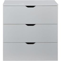 Commode compacte BASIX a 3 tiroirs en bois mélaminé blanc mat. Dimensions : L 78 x P 40 x H 80 cm. Montage facile. Design minimaliste et fonctionnel. Poignées encastrées fraisées. Rails métalliques avec roulements a billes. Certifié FSC. Livraison gratuite en Allemagne (hors îles).