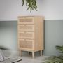 Commode CALASETTEA 4 tiroirs : Organisez votre chambre avec élégance grâce a cette commode CALASETTEA. En décor chene, elle comprend quatre tiroirs avec des faces en cannage, des poignées en métal doré et des pieds en bois. Les tiroirs s'ouvrent completement pour un rangement pratique. Dimensions : 50,4 x 41,4 x 108,8 cm. Référence : CALASETTA CQSK311-D95D.