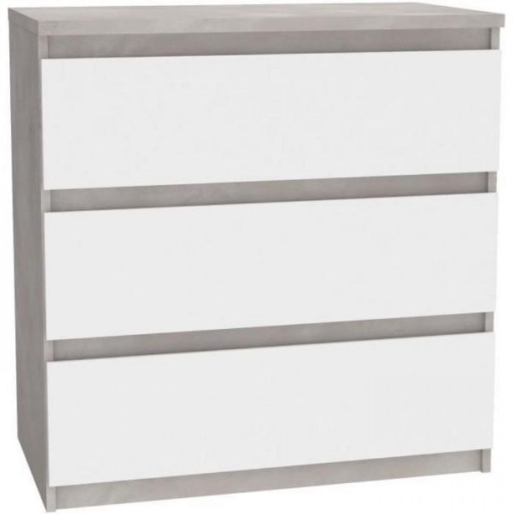 Découvrez la commode CHELSEA avec 3 tiroirs, couleur blanc combiné béton clair. Parfaite pour ranger vos affaires.