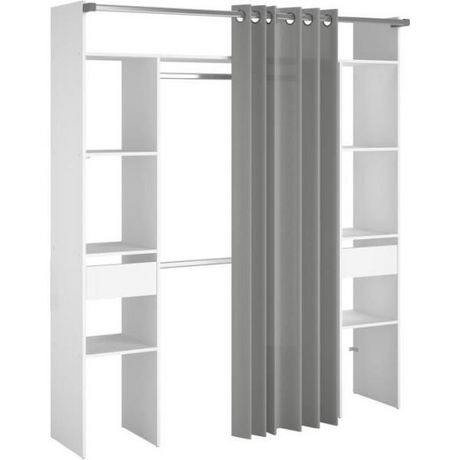 Le kit dressing ARTIC EKIPA est un meuble d'entrée contemporain et design, fabriqué en France. Il est composé d'une structure en bois de panneaux de particules de couleur blanche, avec 2 colonnes comportant 3 étageres, 1 tiroir, 1 tablette hivernage, 2 tubes de penderie et 1 rideau gris. Ses dimensi
