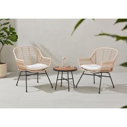 Salon de jardin en résine tressée avec coussins pour 2 personnes. Comprend une table basse de Ø 50x H.45 cm et deux fauteuils de 64 X 64 x H.85 cm. Idéal pour l'extérieur. Couleur principale : beige. Style naturel.