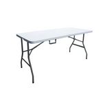 Table pliante de 150 cm pour 6 personnes. Revetement en poudre en tubes d'acier. Supporte facilement une charge de 110 kg. Résiste aux intempéries. Légere et pratique, elle se range facilement. Dimensions : 152 x 70 x 74 cm. Usage intérieur et extérieur. Mode de verrouillage par un systeme de bagues