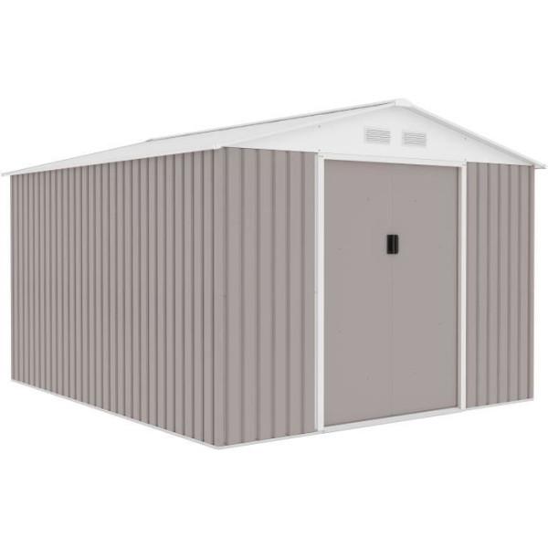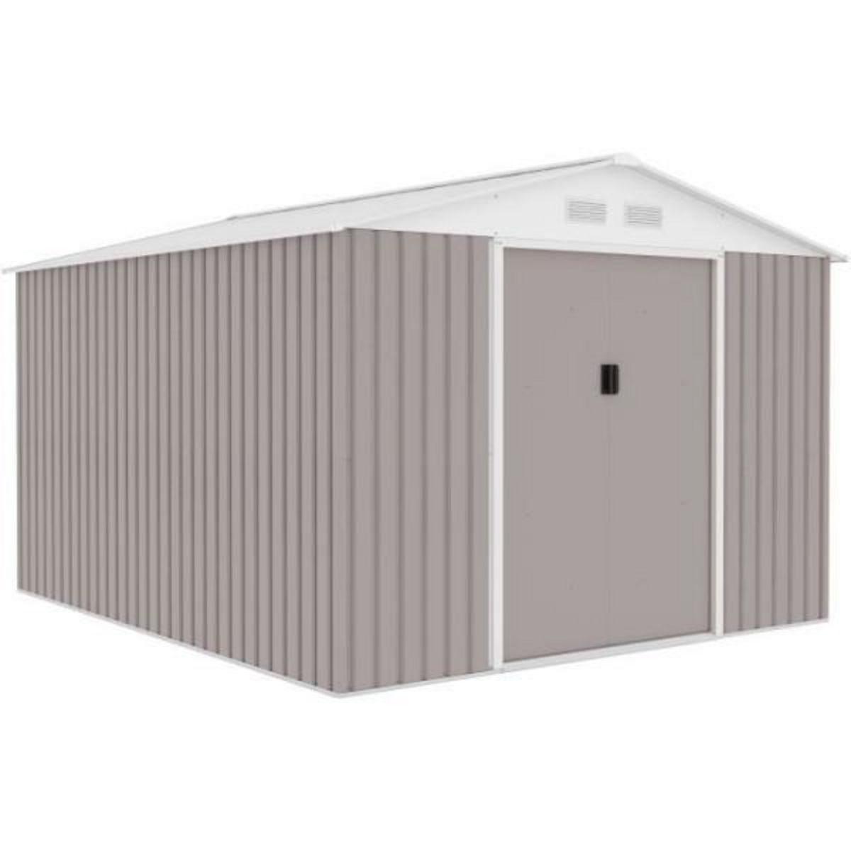 Abri de jardin en acier galvanisé avec kit d'ancrage inclus - 8.84m² - avec 2 portes coulissantes et une serrure - Taupe. Dimensions intérieures: 263x305 cm. Type de Produit: Abri de jardin. Couleur(s): Taupe. Assemblage: En panneau. Matiere de la structure: Métal. Porte: Dimensions portes : L117xH1