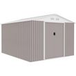 Abri de jardin en acier galvanisé avec kit d'ancrage inclus - 8.84m² - avec 2 portes coulissantes et une serrure - Taupe. Dimensions intérieures: 263x305 cm. Type de Produit: Abri de jardin. Couleur(s): Taupe. Assemblage: En panneau. Matiere de la structure: Métal. Porte: Dimensions portes : L117xH162cm. Dimensions extérieures: 267x309 cm. Type de toit: Traditionnel.