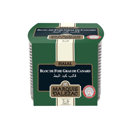 Marquis d'Alezac vous propose de déguster son Bloc de Foie Gras de Canard Halal. Sous contrôle strict de la grande mosquée de Lyon, découvrez deux belles tranches de Bloc de Foie Gras de Canard Halal onctueuses qui s'apprêteront parfaitement en entrée ou en apéritif.