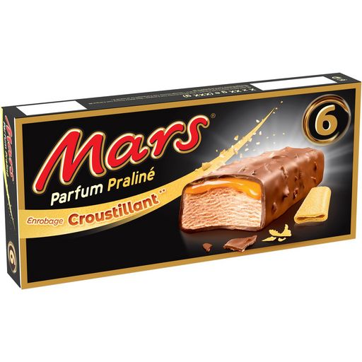 Découvrez la barre glacée Mars® praliné : une crème glacée onctueuse parfum praliné, du caramel fondant, des éclats croustillants de crêpes dentelle, le tout dans un enrobage au chocolat craquant. Crème glacée (50%) parfum praliné, caramel (15%) et enrobage cacao aux éclats de crêpes dentelles (2.1%).