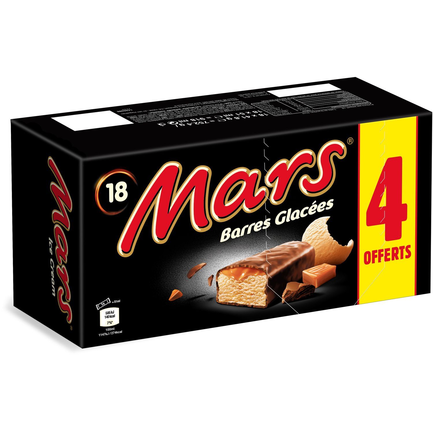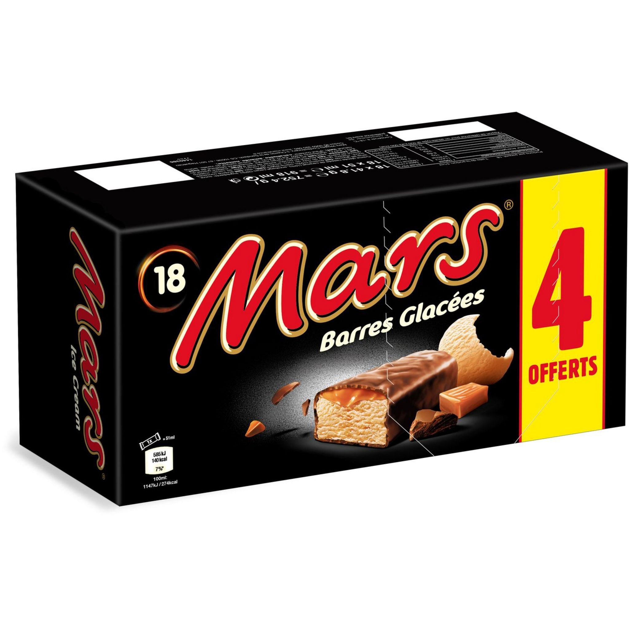 Le goût légendaire de Mars® dans une barre glacée : une crème glacée onctueuse, du caramel fondant le tout dans un enrobage au chocolat craquant. Crème glacée nappée de caramel (16%), enrobage cacao (32%)
