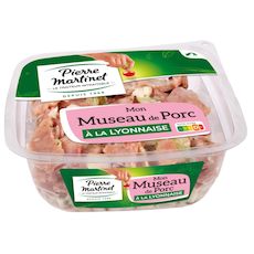 Ingrédients : Ingrédients : museau de porc 51% (pièces de tête de porc, eau, épices, vinaigre d'alcool, sel, dextrose, acidifiants : E330, acide lactique, antioxydant : E316, conservateur : E250), légumes (cornichons (contient SULFITES), oignons), eau, huile de colza, épices, vinaigre d'alcool, moutarde (eau, graines de MOUTARDE, vinaigre d'alcool, sel), sel, amidon transformé, épaississant : gomme xanthane.