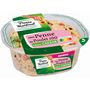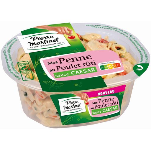 Pâtes cuites 34% (eau, semoule de BLÉ, blanc d’ ŒUF en poudre, sel), poulet traité en salaison cuit rôti 13,6% (filet de poulet (Origine : UE ou Hors UE) 13,1%, eau, sel, dextrose, stabilisants : E451, E452), eau, huile de colza, CRÈME, carottes cuites, tomates, maïs, jus de citron à base de concentré, épices, grana padano (LAIT, sel, présure, conservateur : lysozyme (ŒUF)), vinaigre d'alcool, moutarde (eau, graines de MOUTARDE, vinaigre d'alcool, sel), fromage fondu (FROMAGE, sel de fonte : E339, LACTOSÉRUM), anchois salé (ANCHOIS, sel), huile d'olive vierge extra, jaune d' OEUF en poudre, huile de tournesol, vinaigre de vin, sel, sirop de glucose, amidon transformé, acidifiant : acide lactique, épaississants : gomme xanthane, carraghénanes, conservateur : sorbate de potassium.
