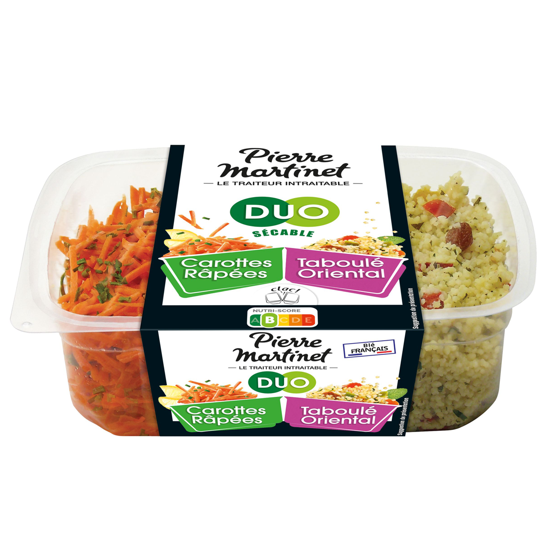 Pierre Martinet a réuni dans une même barquette des Carottes râpées accompagnées d'un savoureux Taboulé oriental. il sera le complice idéal des repas sur le pouce.