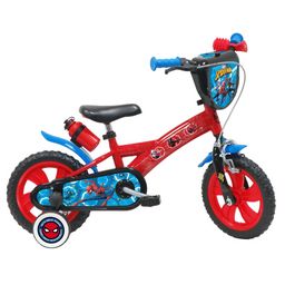 Vélo enfant 12'' - Modèle Spiderman pour enfant de 85 à 100 cm avec stabilisateurs à molettes - Plaque décorative avant - Porte bidon - 1 frein et roues bâtons