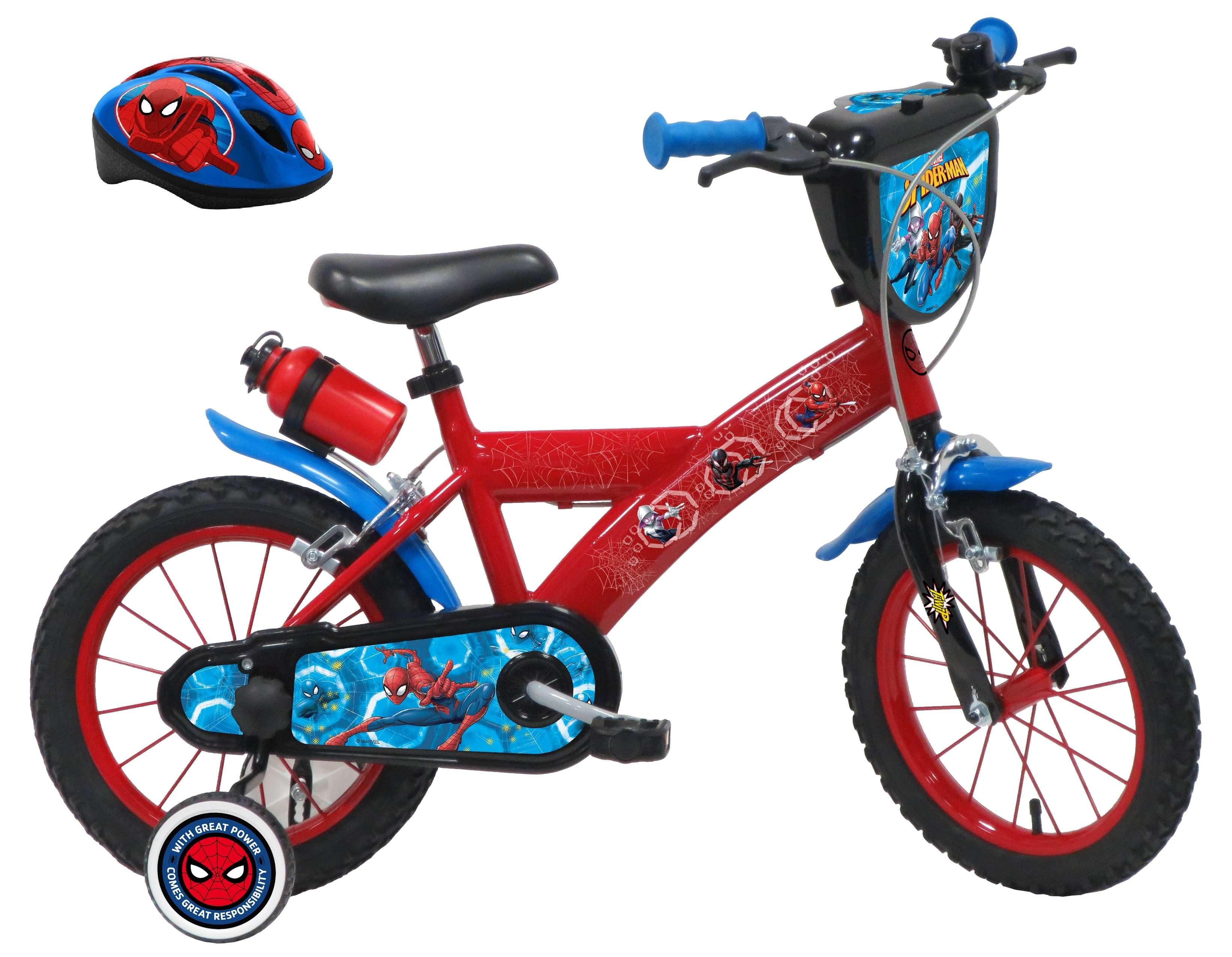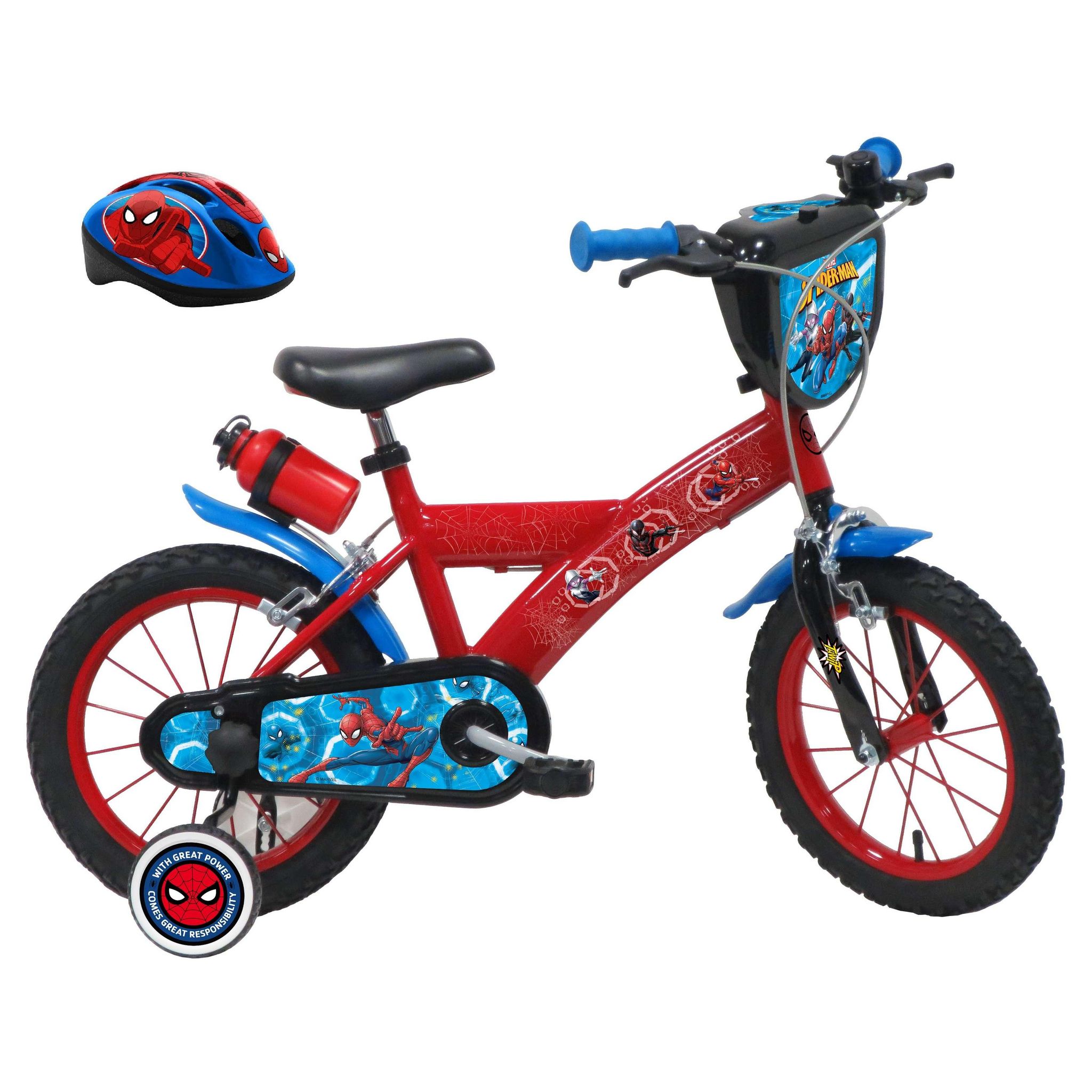 Vélo enfant - Modèle 14'' Spiderman + Casque pour enfant de 95/110 cm avec stabilisateurs - Plaque décorative avant - Porte bidon - 2 freins