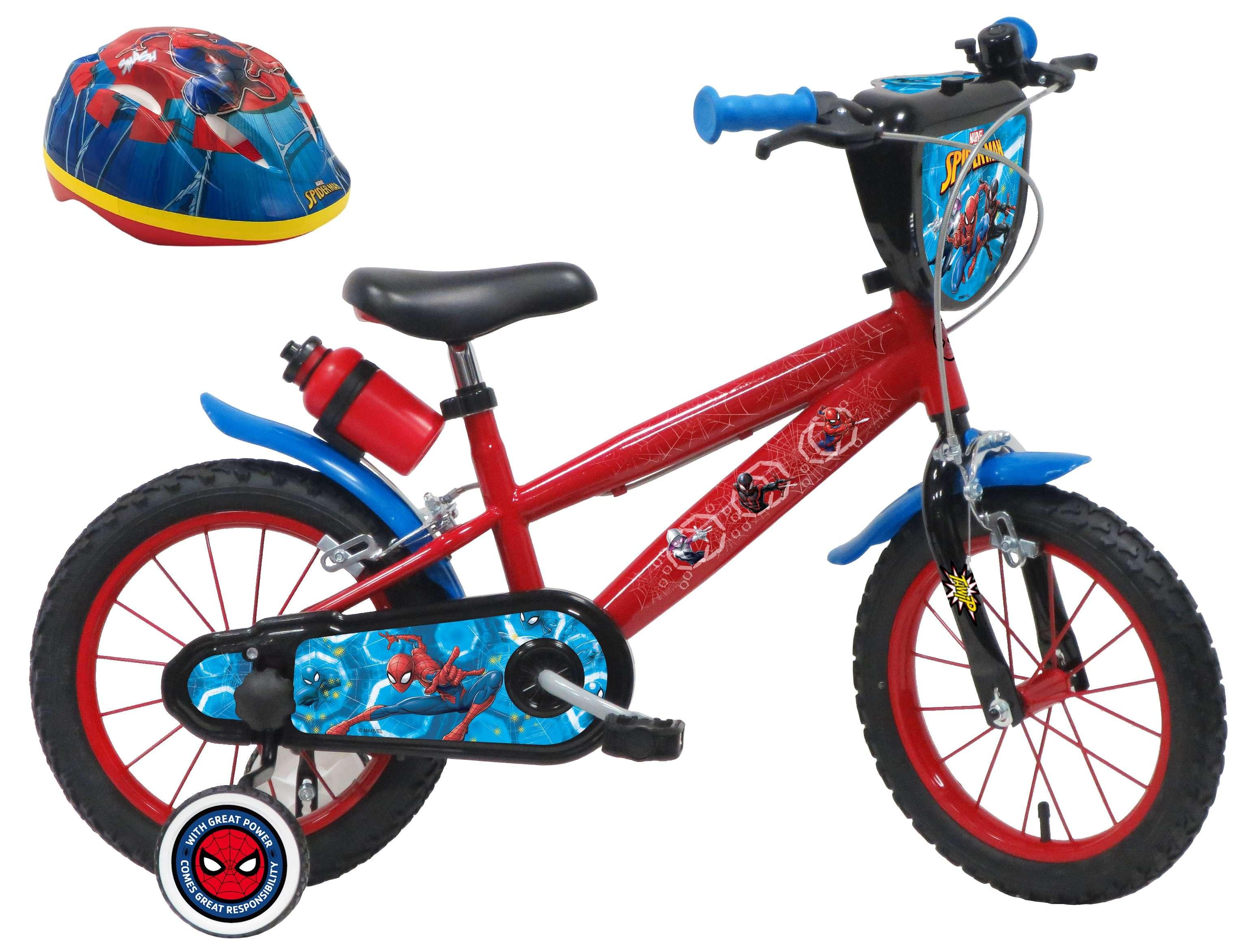Vélo enfant - Modèle 14'' Spiderman + Casque - Pour enfant de 95 à 110 cm avec stabilisateurs - Plaque décorative avant - Bidon arrière & 2 freins.