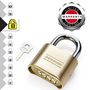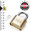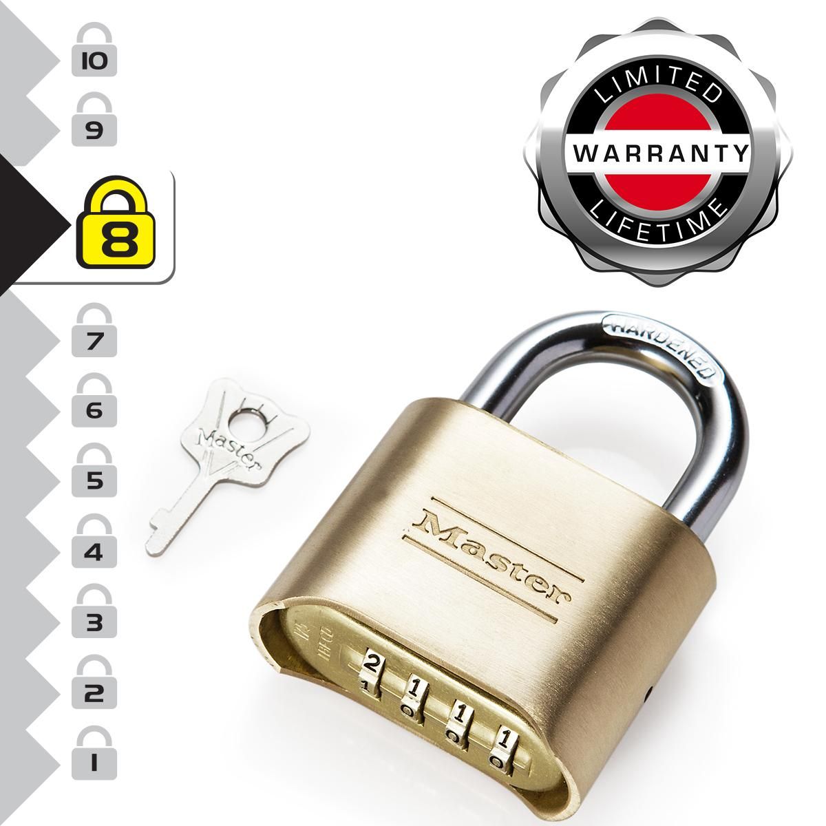Le cadenas à combinaison programmable Master Lock n° 175EURD présente un corps en zinc massif au fini laiton de 52 mm de largeur pour plus de résistance et de protection contre les intempéries ainsi qu'une anse en acier cémenté de 26 mm de hauteur et de 8 mm de diamètre pour une excellente résistanc