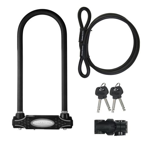 L'antivol en U Master Lock nº 8285EURDPRO avec câble à extrémités en boucle présente un corps d'une largeur de 11 cm en acier cémenté pour un maximum de résistance et de fiabilité. L'anse à double verrouillage de 16 mm de diamètre fait 28 cm de haut. Elle est en acier cémenté pour une résistance acc