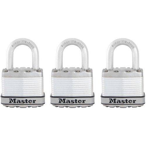 Les cadenas laminés Excell® Master Lock nº M1EURTRI disposent d'un corps de 45 mm de large en acier laminé pour une résistance et une fiabilité accrues et ils sont entourés par des composants en acier inoxydable et en zinc pour une meilleure résistance aux intempéries. L'anse octogonale de 8 mm de diamètre et 24 mm de haut se compose de carbure de bore Tough-Cut™, 50 % plus résistant que l'acier cémenté, offrant une résistance maximale à la coupe et au sciage. Le cylindre à 4 goupilles offre plus de résistance au crochetage et le double verrouillage à billes offre une résistance maximale contre le forçage et le martelage. Ce cadenas haute sécurité est parfaitement adapté pour l'extérieur et pour sécuriser portails, grillages, garages ou encore remises. Le pack comprend 3 cadenas et 4 clés qui fonctionnent pour l'ensemble des cadenas. La garantie à vie limitée vous garantit une tranquillité d'esprit grâce à une marque sur laquelle vous pouvez compter.