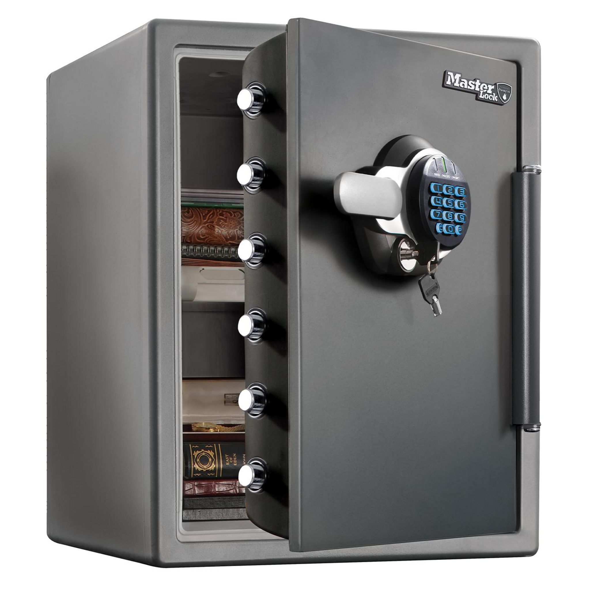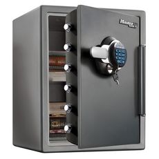 Le grand coffre-fort à combinaison électronique et à clé Master Lock nº LYW123GTC est conçu pour protéger documents, supports numériques et autres objets de valeur (bijoux, espèces, disques durs externes, etc.) contre les incendies, inondations et vols. En acier, certifié UL/ETL, ce coffre-fort off