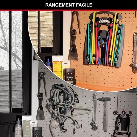 L'assortiment de tendeurs Master Lock n° 3043EURDAT comprend 10 tendeurs avec crochets double fil pour une résistance supérieure. Le design avec des crochets inversés sur le tendeur permet d'avoir un espace d'accrochage plus large. Le bout des crochets est arrondi pour prévenir les risques de rayure