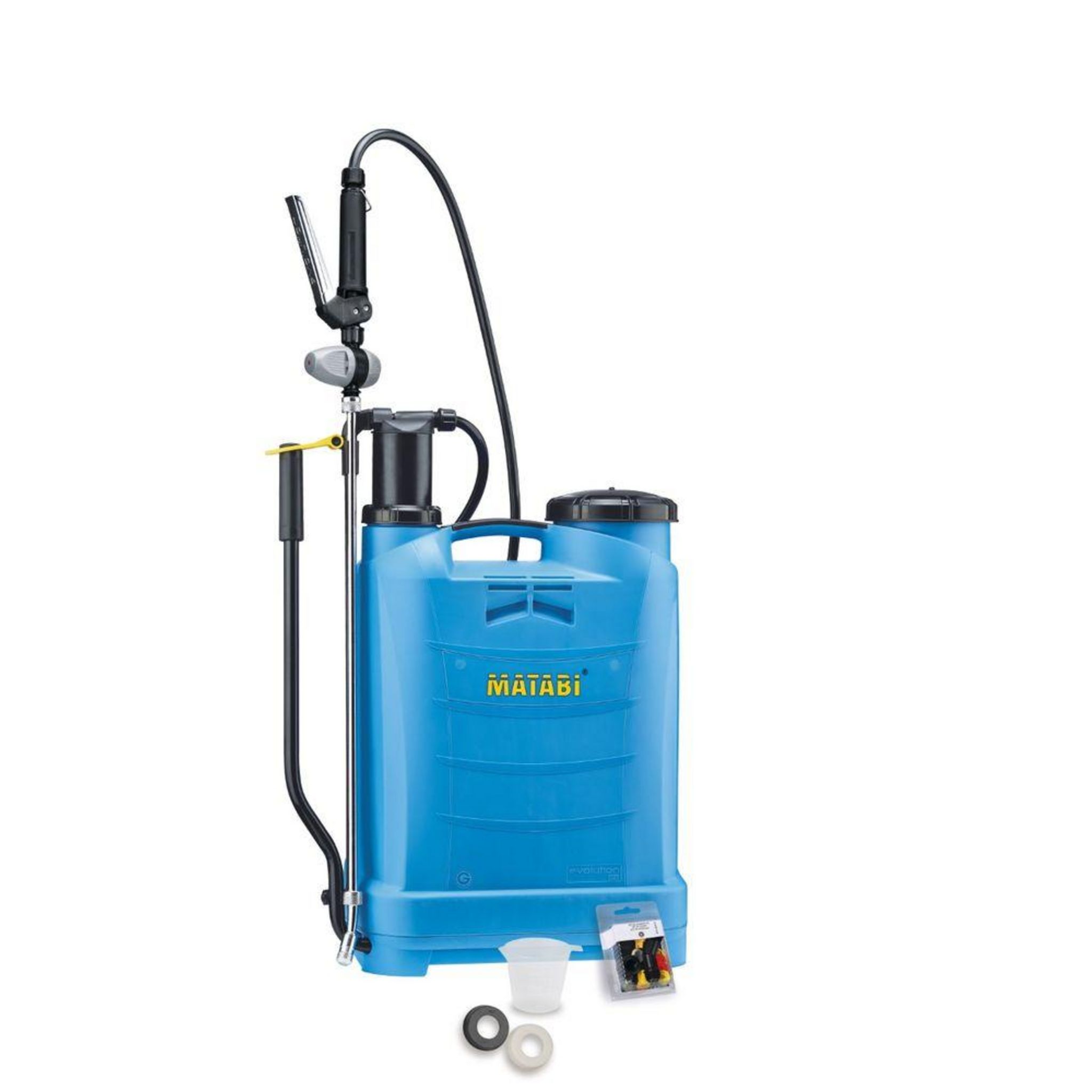 - Accessoires standard régulateur de pression, set de buses (coude herbicides et buses à éventail, miroir et disque), deux systèmes de retenue (1 caoutchouc et 1 synthétique) et un doseur.