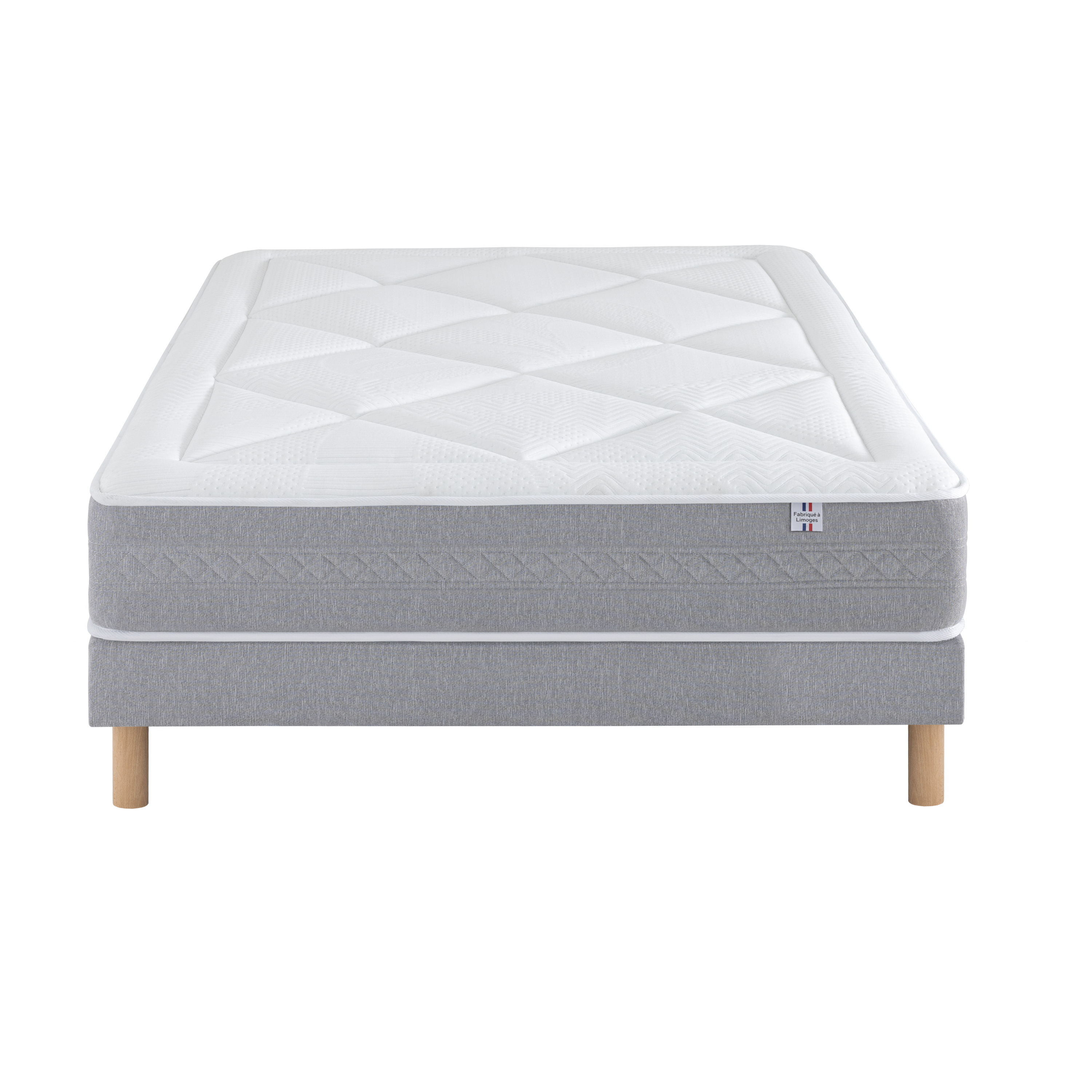 Accueil enveloppant / Soutien équilibré / 744 ressorts ensachés + mémoire de forme 42 kg/m3 / Epaisseur 28 cm / Fabrication Française