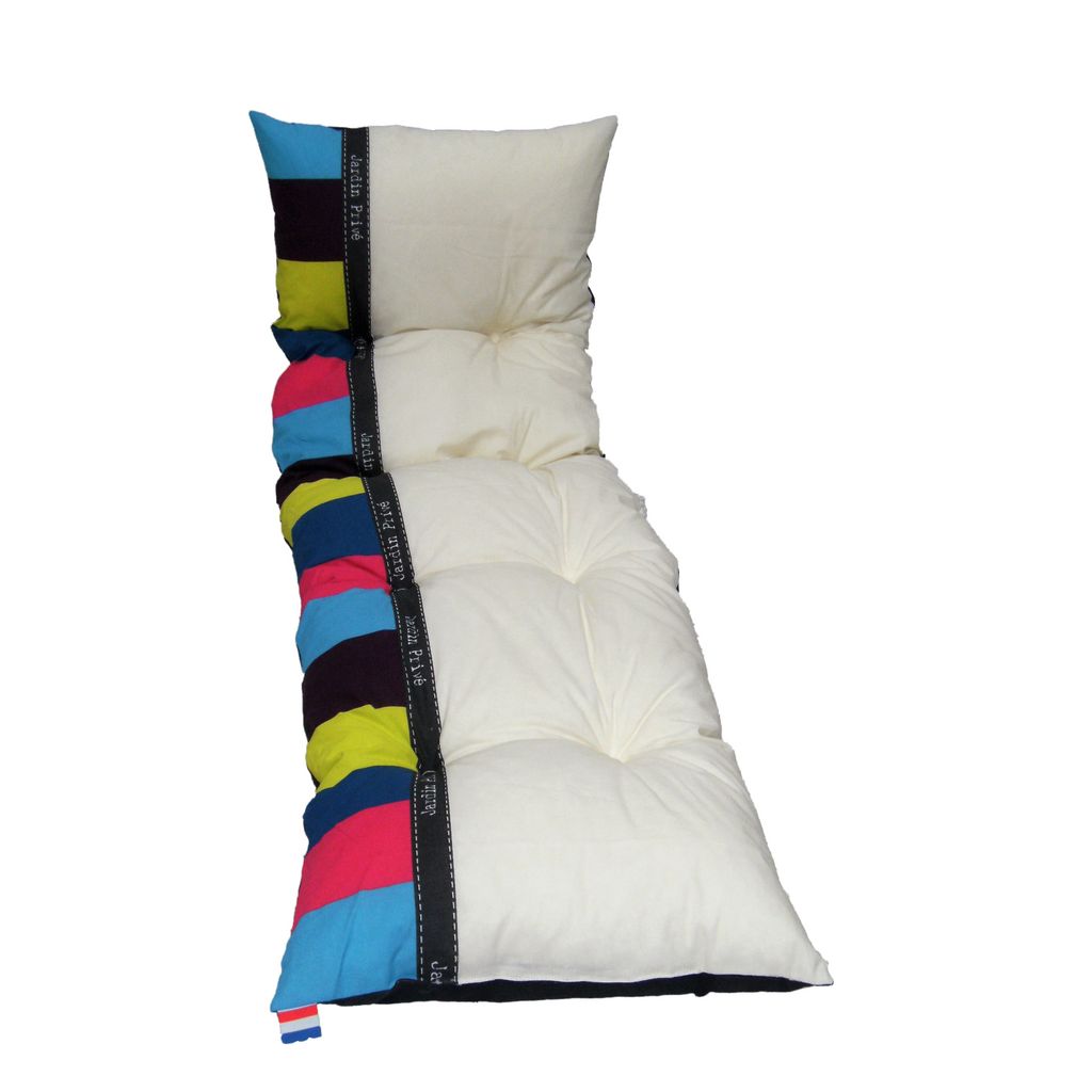 Vous pourrez profitez pleinement du soleil grâce à ce coussin bain de soleil flocons Enjoy Optimistic. Tissu 100% coton, garnissage flocons de mousse. Coté face motif enjoy multicouleurs, coté dos ardoise. Coussins avec finitions biais large. Liens en fond d'assise.
