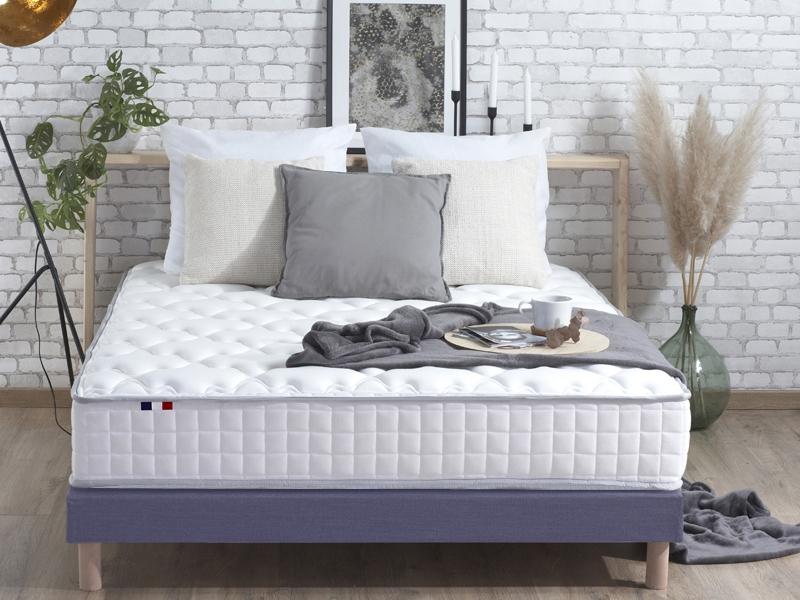 Matelas Ressorts Caractéristiques :Épaisseur : 23 cm Accueil : Équilibré Soutien : Ferme Composition :Ame : Ressorts ensachés 406 ressorts en 90x190 / 638 ressorts en 140x190 / 806 ressorts en 160x200 / 899 ressorts en 180x200 Isolation par 2 cm de mousse s Face hiver : 5 mm de mousse + 200 g/m2 ouate hypoallergénique + 400 g/m2 de demi laine (côté bandeau) Face été : 5 mm de mousse + 200 g/m2 ouate hypoallergénique + 300 g/m2 de coton Coutil : Stretch 100 % polyester Traitement : pour une hygiène parfaite, le tissu est traité anti-acariens, antibactériens et hypoallergénique Tous nos tissus et mousses sont certifiés exempts de substances nocives ou de produits chimiques par Oeko-Tex. Ce matelas dispose de 2 faces de couchage, pensez à retourner votre matelas tous les 6 mois et à inverser tête et pieds tous les 3 mois pour optimiser sa durée de vie au maximum ! L'utilisation d'un protège-matelas + drap-housse permet également assurer à votre literie une protection optimale. Matelas Fabriqué en France Garantie 5 ans* *Garantie dégressive. Voir conditions au dos de votre étiquette produit