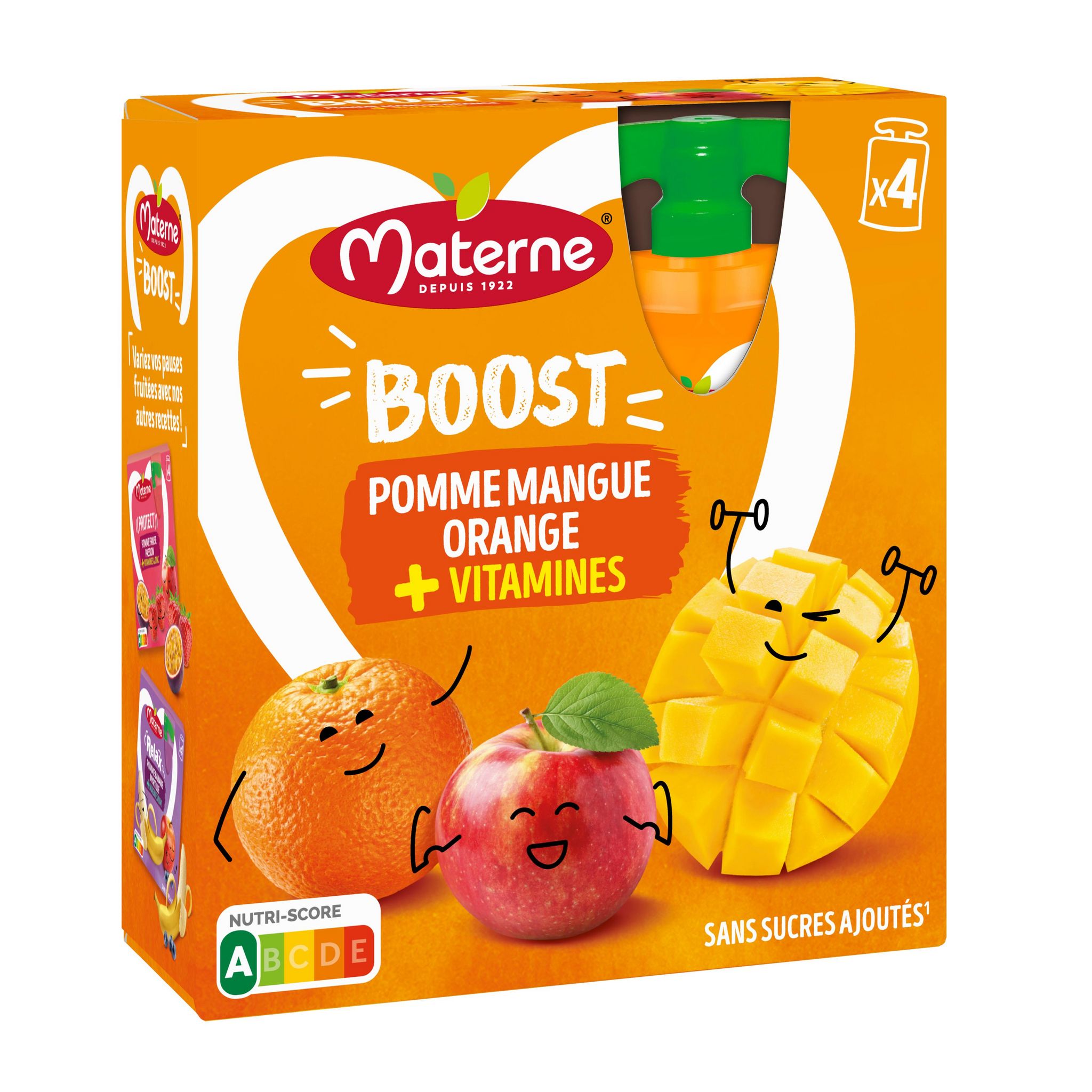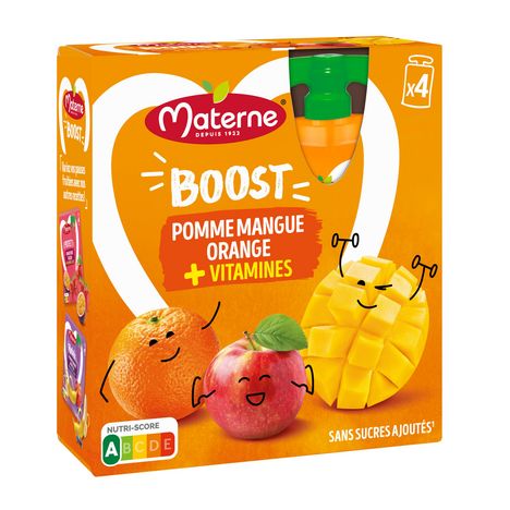 Découvrez notre nouvelle gamme de compote en gourde Materne, pensée pour les adultes, enrichie en vitamines et/ou minéraux, qui vous accompagnera au quotidien en s'adaptant à votre besoin du moment : plutôt Boost, Relax ou Protect ? Des recettes originales et intense en goût, avec de délicieux mélanges de fruits associés à des vitamines et/ou minéraux pour contribuer à votre bien-être. Découvrez Boost, une recette savoureuse pour se sentir bien au quotidien : - Source de vitamines B1, B2, B6, E - Sans Sucres Ajoutés* - Nutri-Score A * Contient des sucres naturellement présents